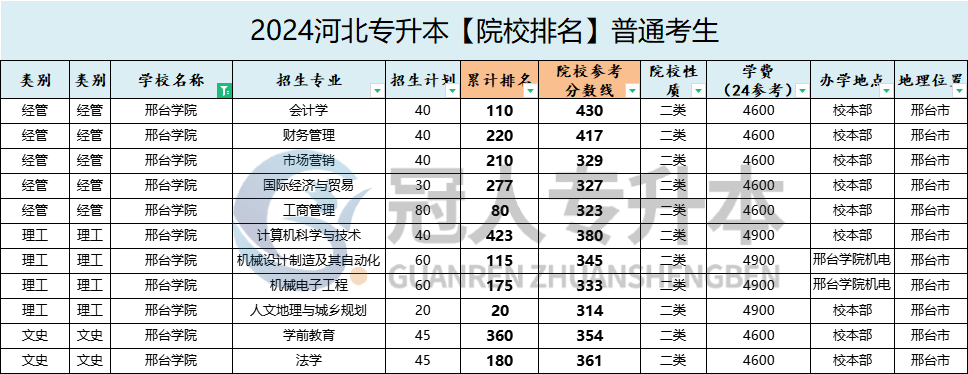 2025年邢台学院专升本数据还没有公布,2025年邢台学院专升本考生可以参考2024年邢台学院专升本各个专业的具体上课院校位置。