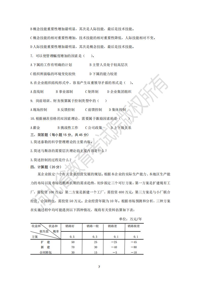 河北省普通高等学校专升本考试管理学原理模拟试卷及参考答案