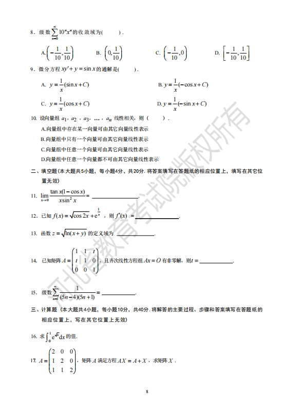 > 河北省普通高等学校专升本考试 高等数学 (二) (经管、农学类) 模拟试卷 1