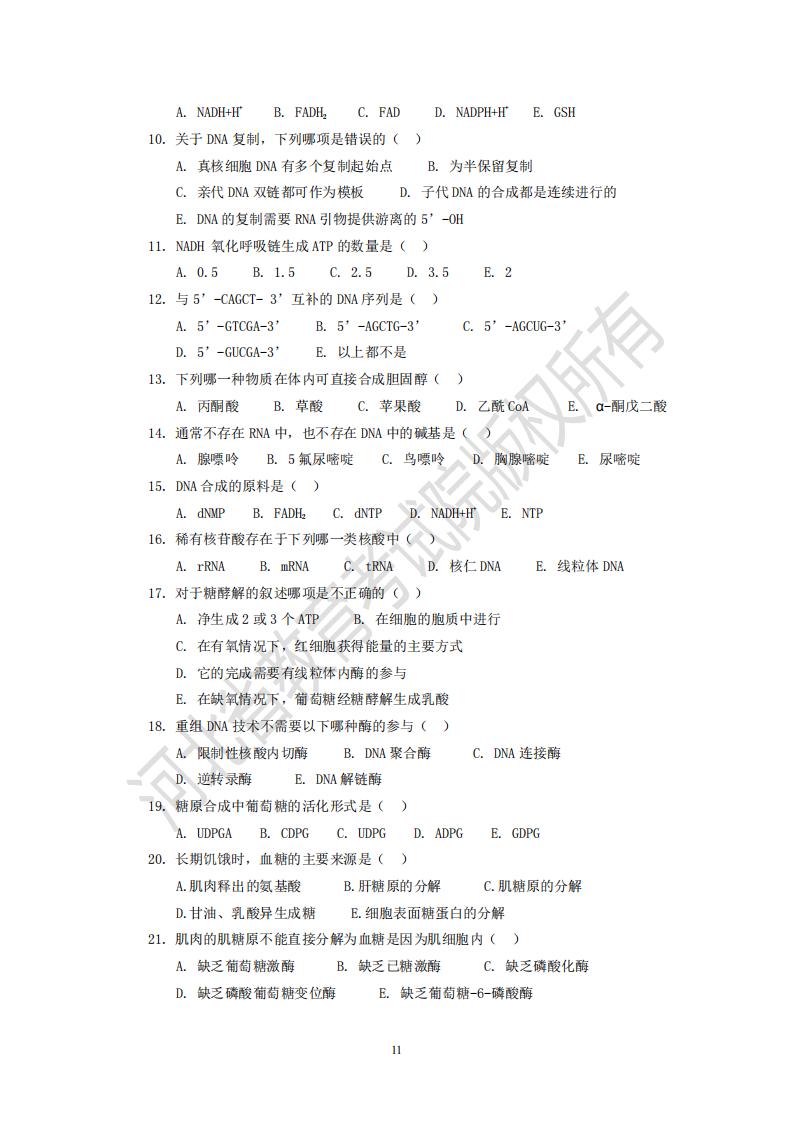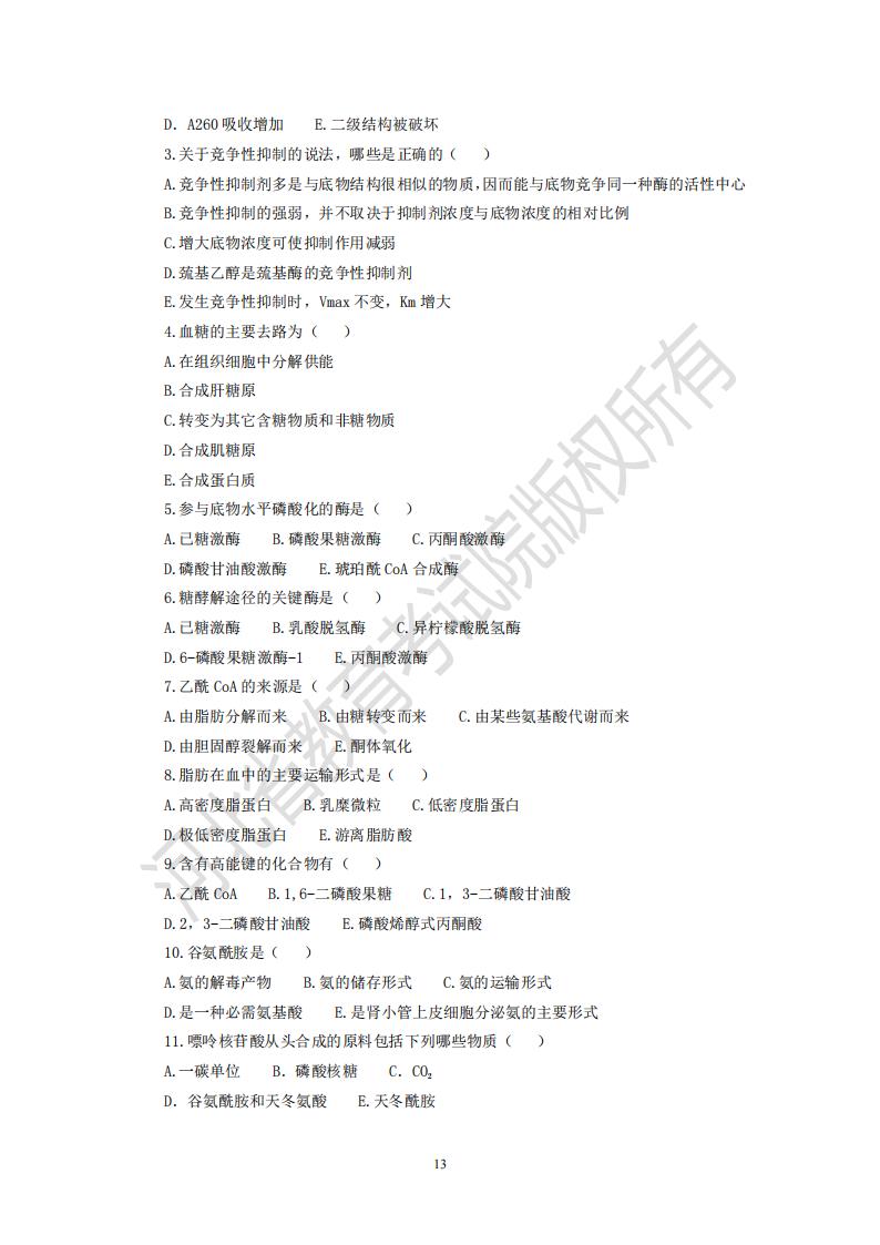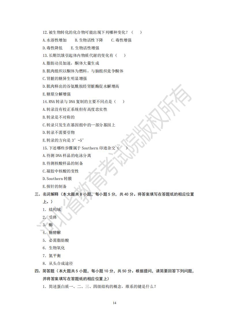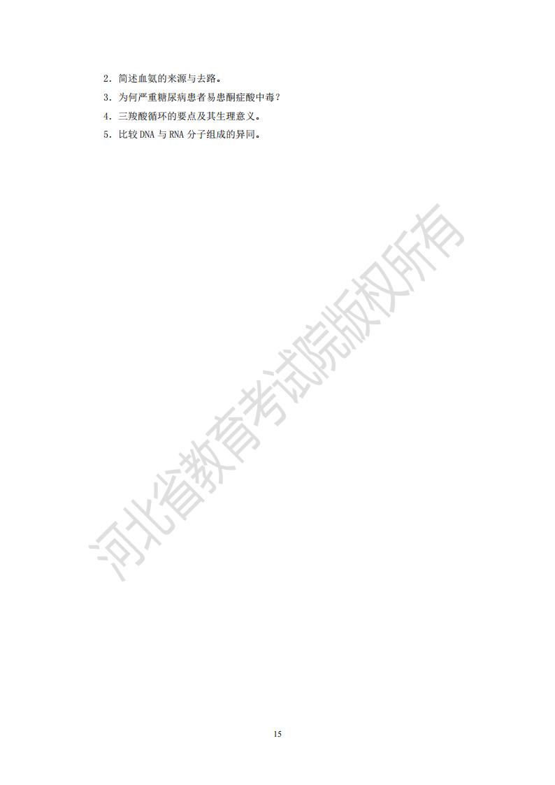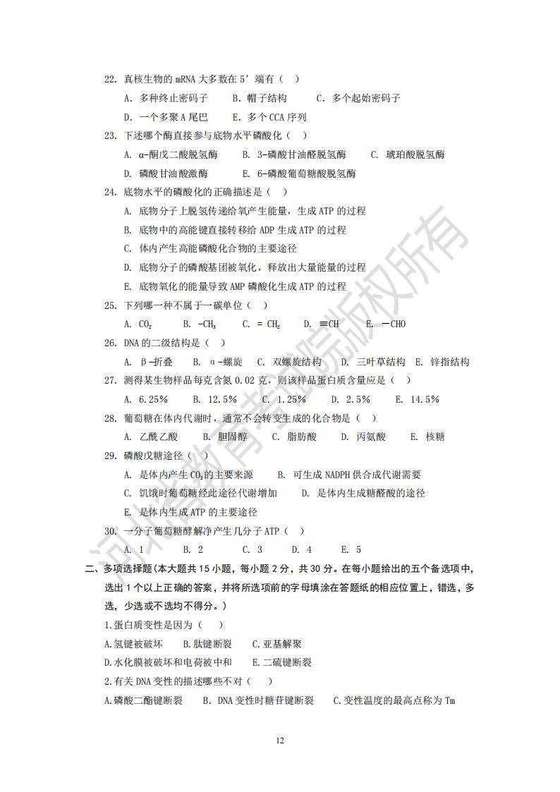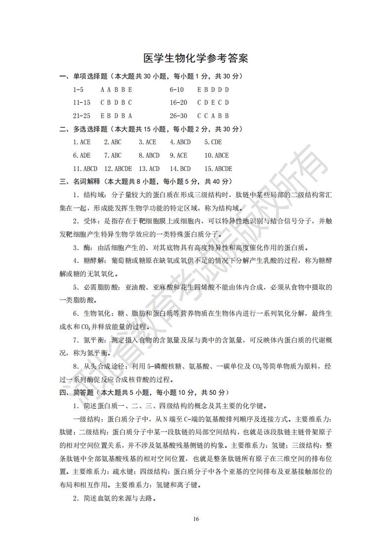 河北省专升本考试 医学生物化学模拟试卷及答案 考试形式与试卷结构 考试采用闭卷、笔试形式,全卷满分为 150 分,考试时间为 75 分钟。 试卷包括单项选择题、多项选择题、名词解释和简答题。单项选择题分值合计 30分,多项选择题分值合计 30 分,名词解释分值合计为 40 分,简答题分值合计为 50 分。