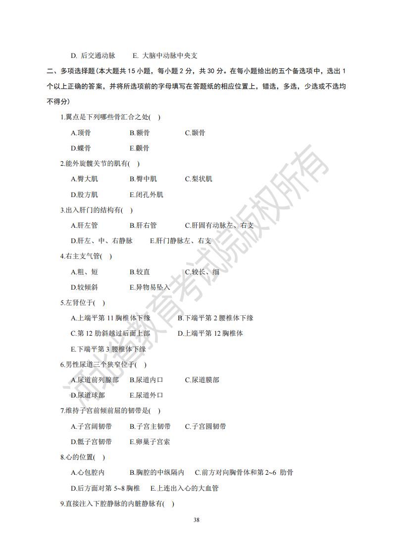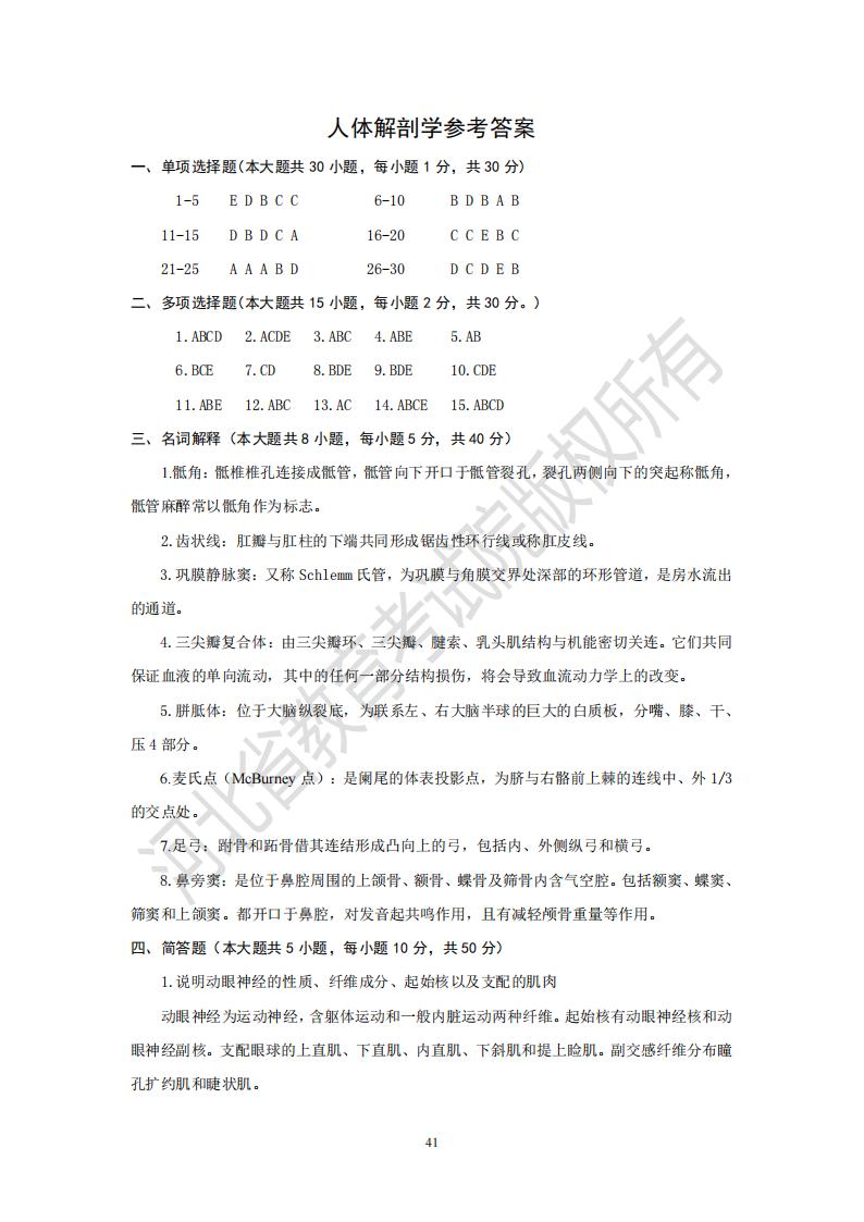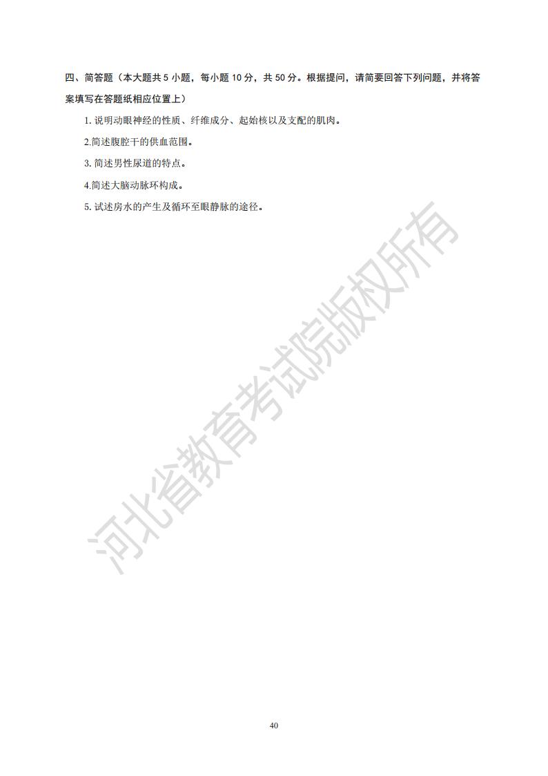 河北省专升本考试 人体解剖学模拟试卷及答案 考试采用闭卷、笔试形式,全卷满分 150 分,考试时间为 75 分钟。 考试包括单项选择题、多项选择题、名词解释和简答题。单项选择题分值合计为 30分,多项选择题分值合计 30 分,名词解释题目分值合计为 40 分,简答题分值合计为 50 分。