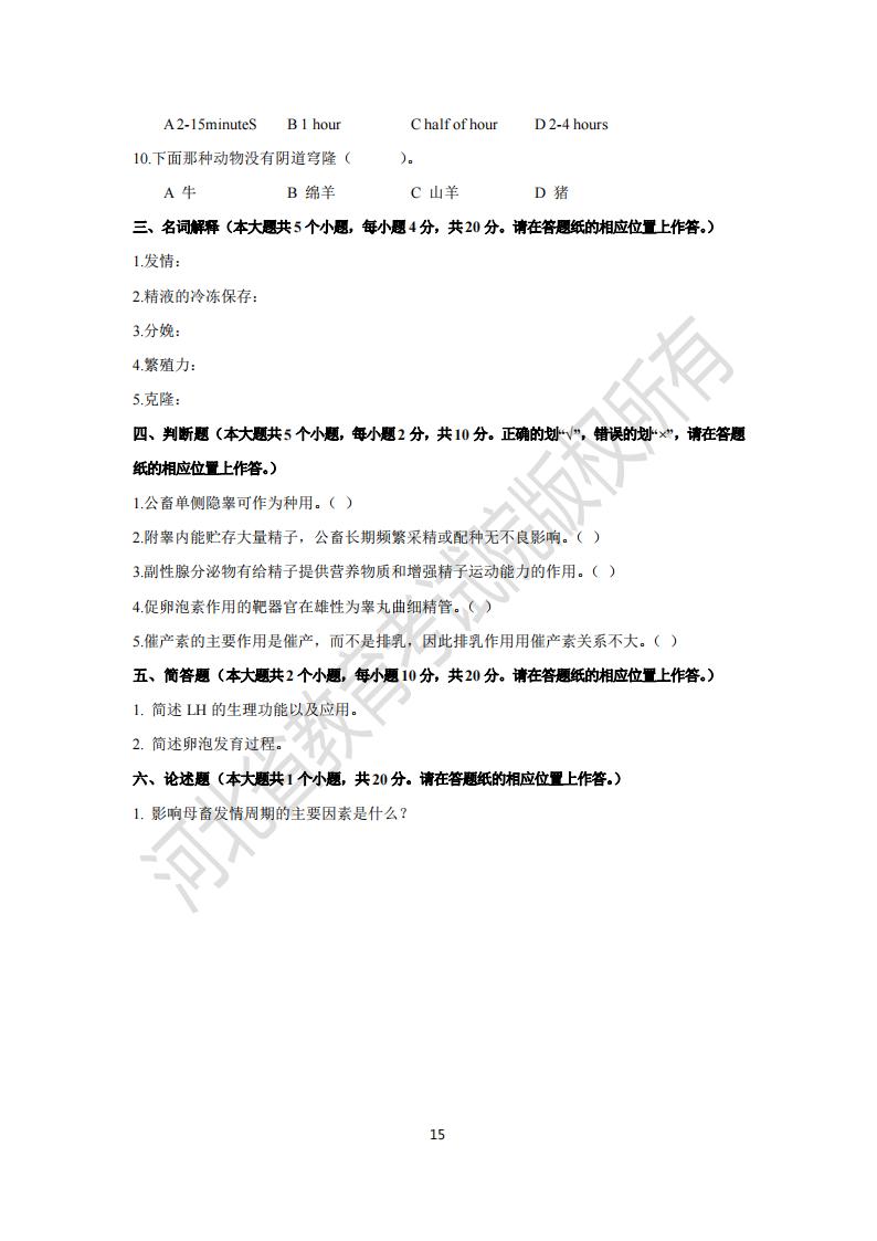 > 河北省专升本考试动物繁殖学模拟试卷及参考答案