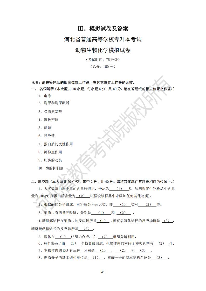 河北省普通高等学校专升本考试 动物生物化学模拟试卷及参考答案