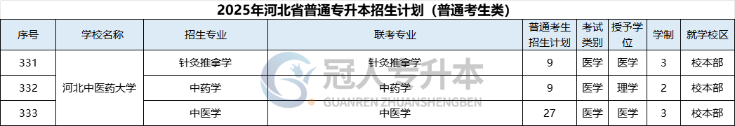 2025年河北省普通专升本河北中医药大学专升本招生计划已公布,参加2025年河北专升本考试的考生请查看下表2025年河北中医药大学专升本招生计划信息。