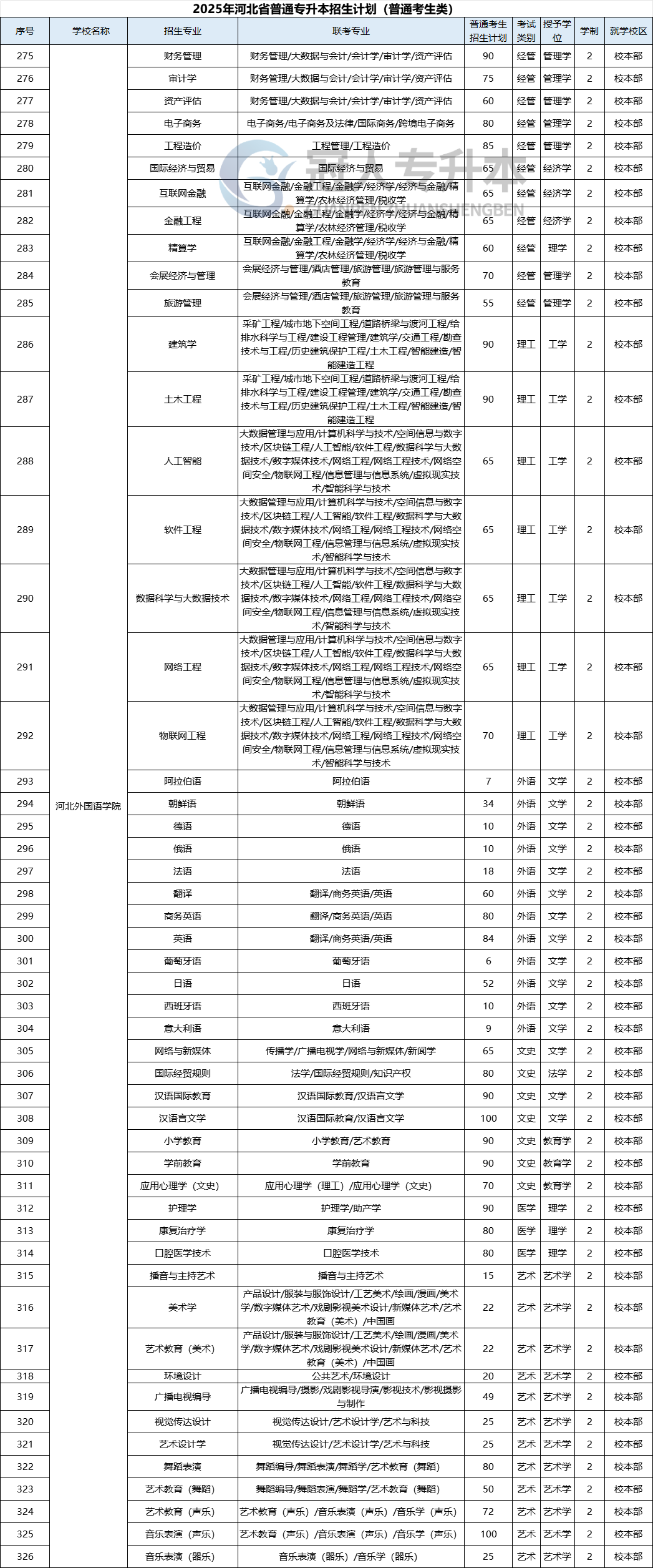 2025年河北省普通专升本河北外国语学院专升本招生计划已公布,参加2025年河北专升本考试的考生请查看下表2025年河北外国语学院专升本招生计划信息。