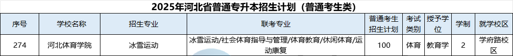 2025年河北省普通专升本河北体育学院专升本招生计划已公布,参加2025年河北专升本考试的考生请查看下表2025年河北体育学院专升本招生计划信息。
