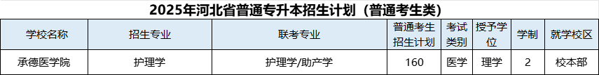 以上信息是“2025年河北省专升本承德医学院招生计划”的相关介绍。河北省专升本考生可以将我们加入到收藏夹,我们会持续更新河北省普通专升本考试方面的相关资讯,政策,各院校招生计划,分数线,录取率等信息。