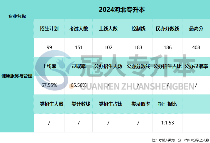 2025年河北省专升本考试将与2025年4月19日进行,河北专升本考试健康服务与管理专业上线人数还没有公布,参加2025年河北专升本考试的考生可以参考下表中2024年健康服务与管理专业上线人数。