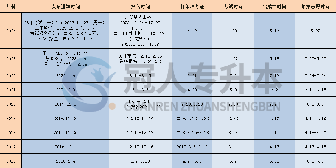 | 年份 | 发布通知时间 | 报名时间 | 打印准考证 | 考试时间 | 出成绩时间 | 填报志愿时间 |