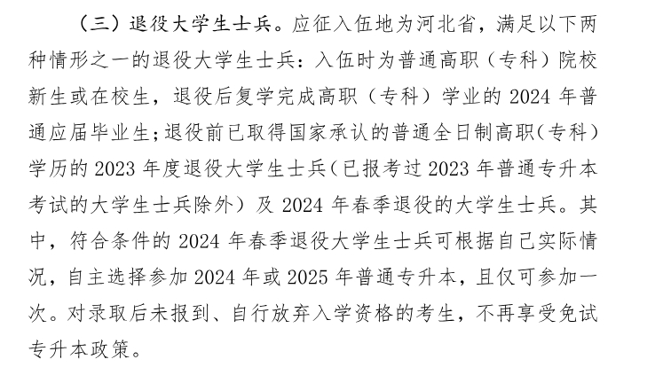 1-应征入伍地为河北省,满足以下两种情形之一的退役大学生士兵入伍时为普通高职(专科)院校新生或在校生,退役后复学完成高职(专科)学业的 2023 年普通应届毕业生;退役前已取得国家承认的普通全 日制高职(专科)学历的 2022 年度退役大学生士兵及 2023年春季退役的大学生士兵。