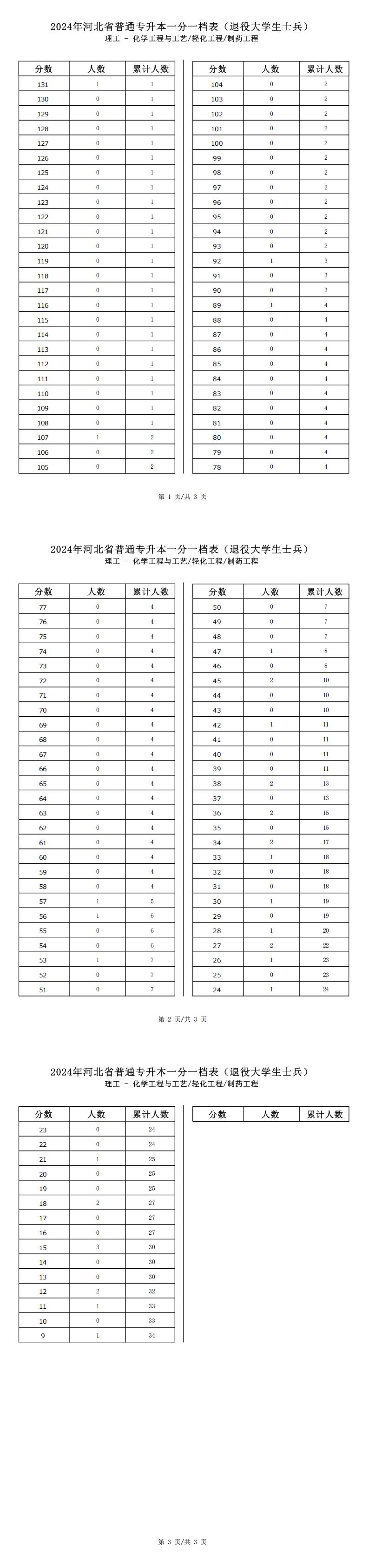2025年河北理工类制药工程专升本退役士兵一分一档表还没有公布,参加25年河北专升本的退役士兵考生可以参考2024年河北省普通专升本制药工程退役士兵考生一分一档表中的数据。