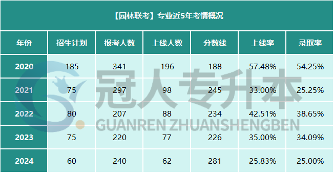 录取率:分数线的上涨,竞争的增强,自然带来了录取率的降低,明年园林联考的考情还不明朗